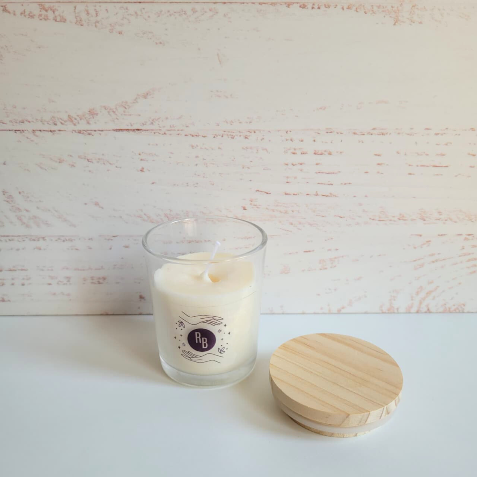 Vela Artesanal 90 ml elaborada en base a cera de soya, sin parafinas.